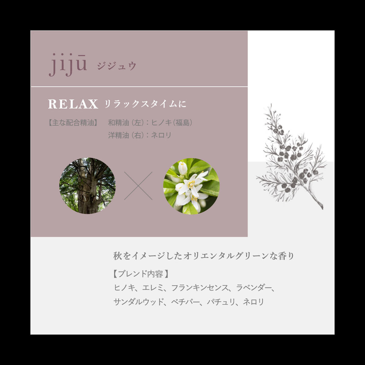 香りのメインに使用している日本の植物の香りは、日本人にとってなじみ深く心落ち着く香り。