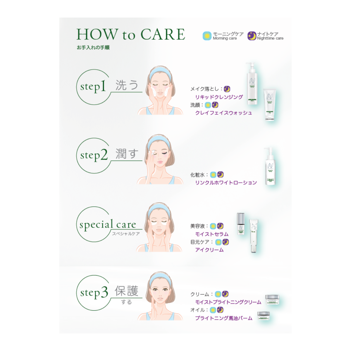 機能性成分を組み合わせることで年齢を重ねた様々なお悩みに多方面からアプローチ。肌へのやさしさを考え、エタノール、パラペン、鉱物油、着色料、紫外線吸収剤は不使用。