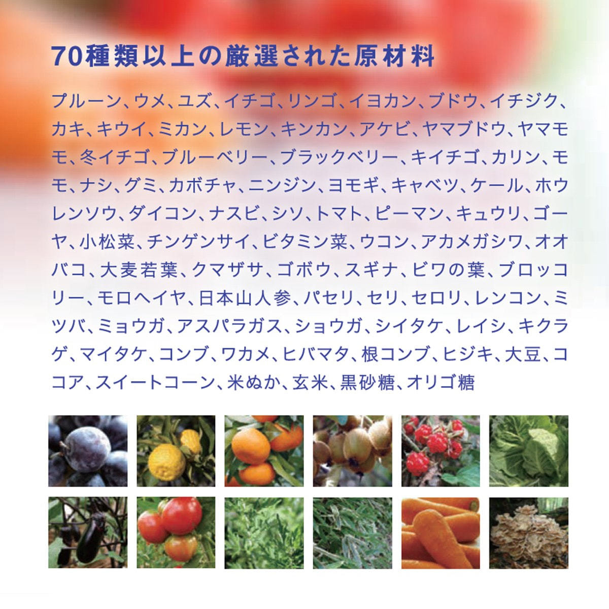 原材料名:イソマルトオリゴ糖(国内製造)、植物発酵エキス(黒砂糖、キャベツ、イチゴ、リンゴ、その他)、リンゴ果汁、パインアップル果汁、リンゴ酢、ピーチ果汁、ブドウ果汁、レモン果汁、スダチ果汁、植物性珪素濃縮、酵母(亜鉛含有)、AFA発酵エキス(AFA、乳酸菌)(一部にリンゴ・キウイフルーツ・大豆・モモ を含む)